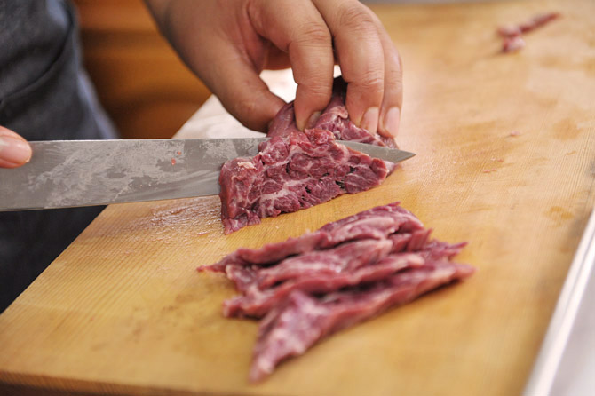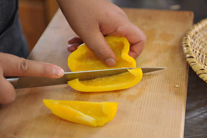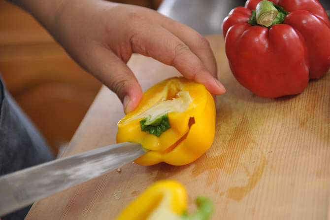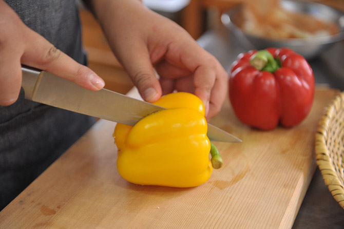 まな板と並行に、さっくり切りましょう。