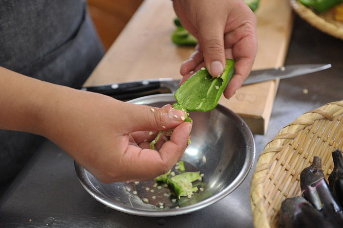 手で、ヘタと種をはずしましょう。