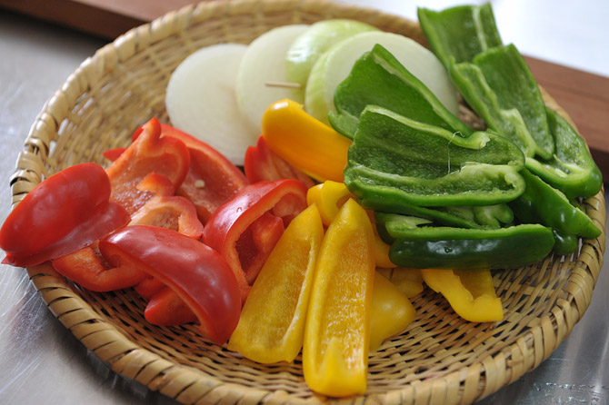 タマネギとパプリカ、ピーマンの下準備終了です。