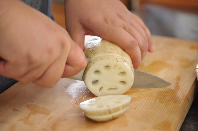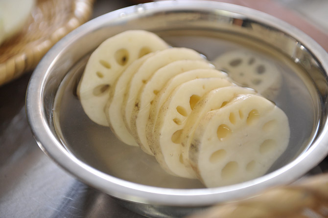 れんこんは、食べやすい厚さに輪切りにして‥‥