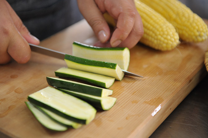 ズッキーニは、ヘタを落とし、半分の長さに切ってから、