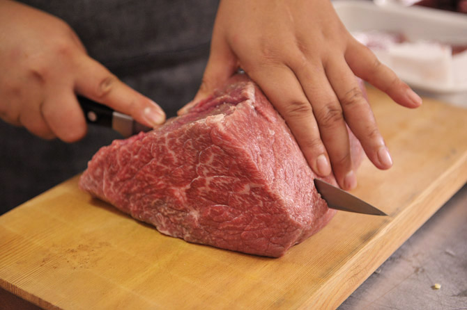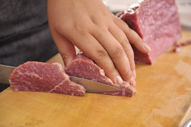 ぶ厚いステーキとして切って、焼いて、