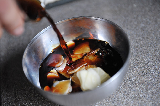 カサの内側に醤油をたらします。