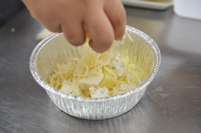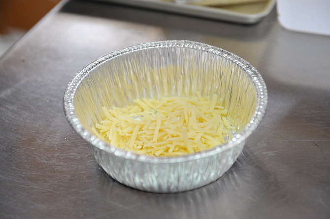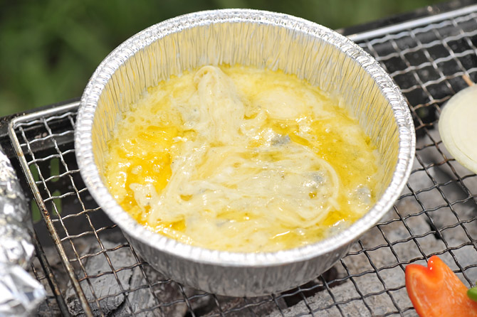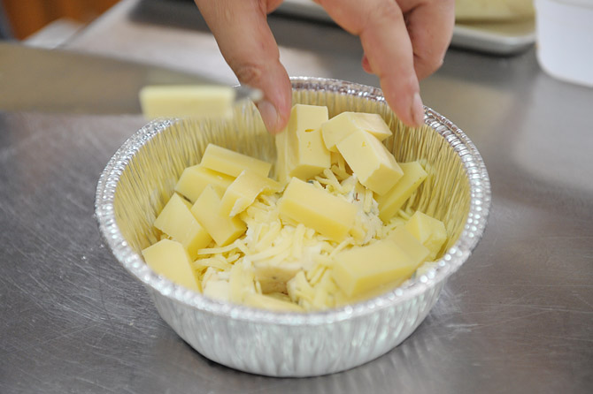 火にかけても大丈夫なアルミホイルの容器に、チーズを入れます。