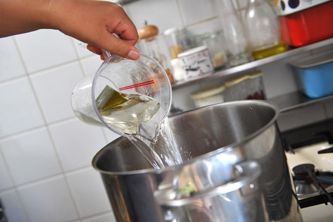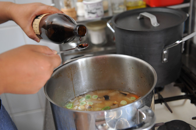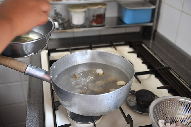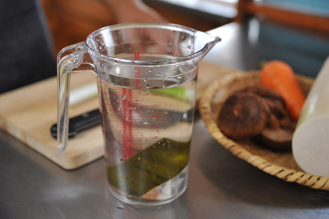 続いて、だしを入れます。飯島さんは「こんぶ水」と呼んでいました。