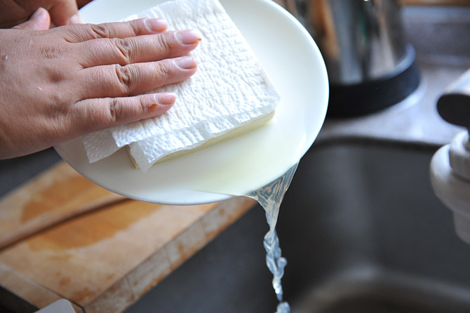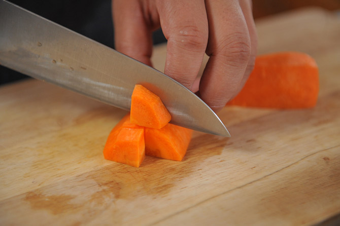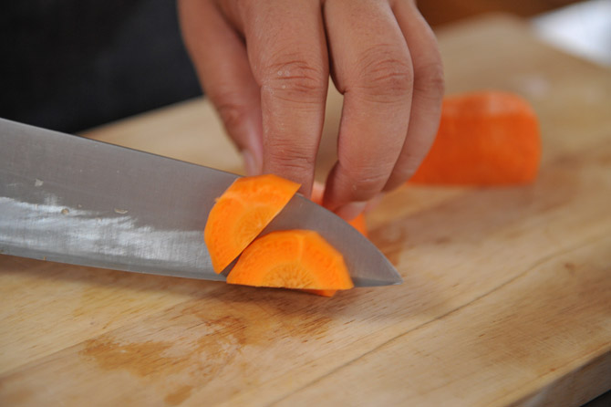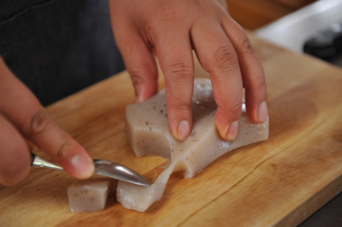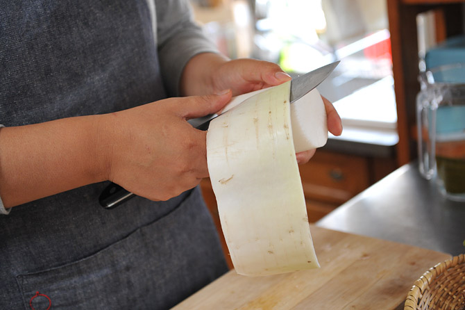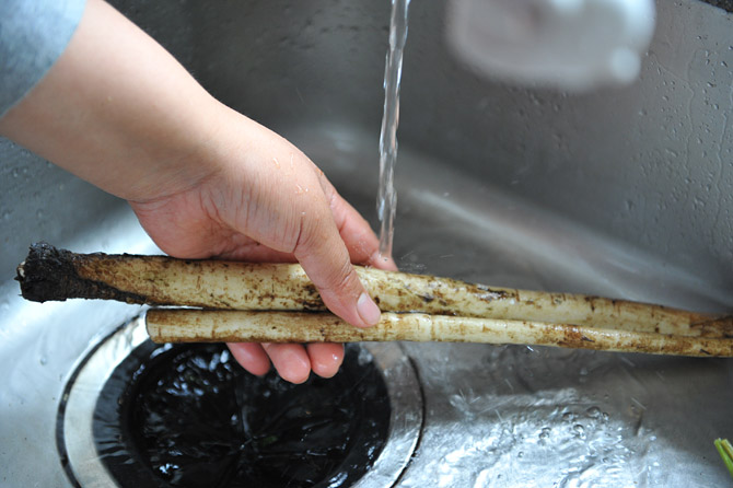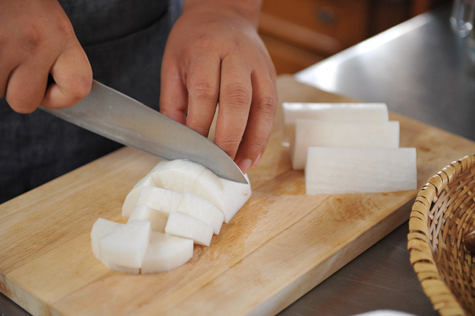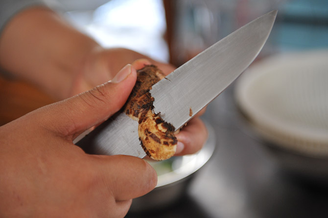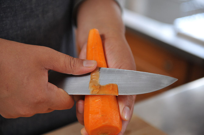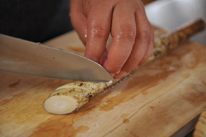 とれない強い汚れは、包丁の背でこそいで落とします。