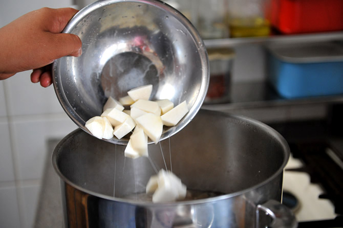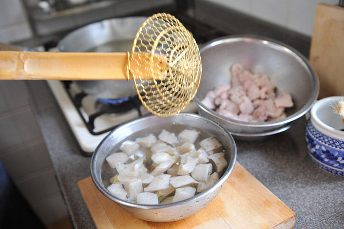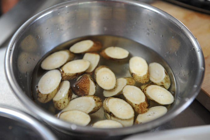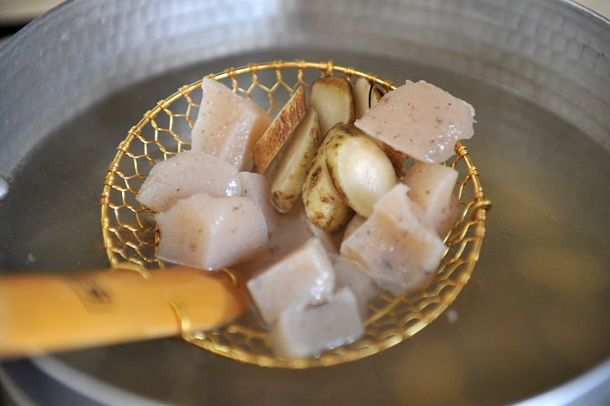 そのまま、同じ鍋で、ごぼうとこんにゃくをいっしょに茹でます。