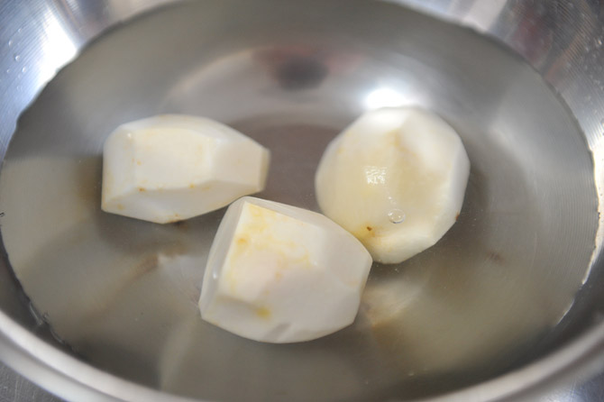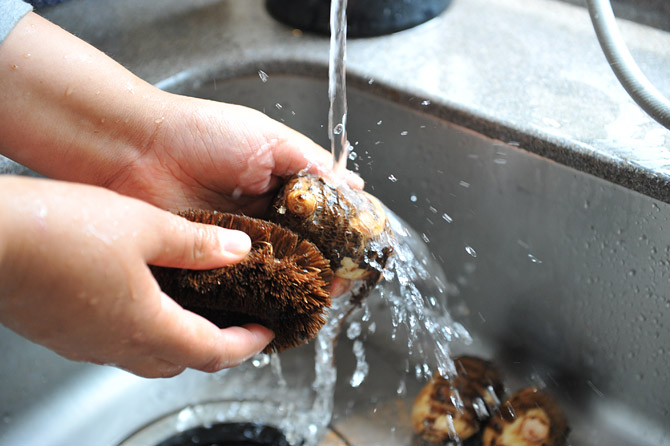 さといも。たわしで洗っておきます。切るのは、煮る直前に。