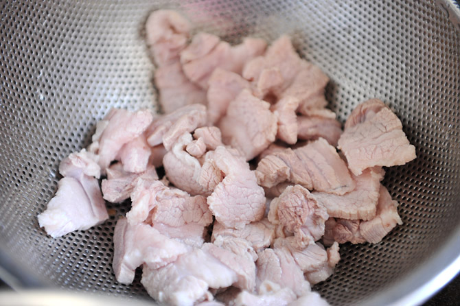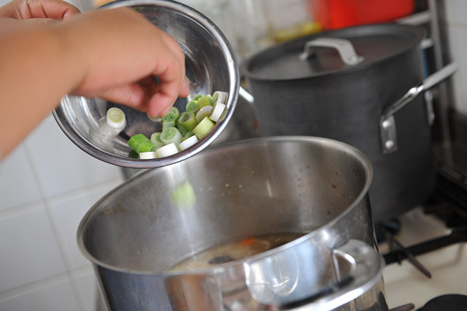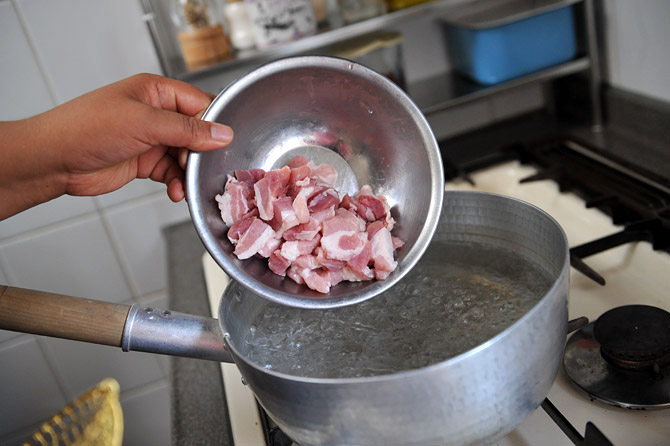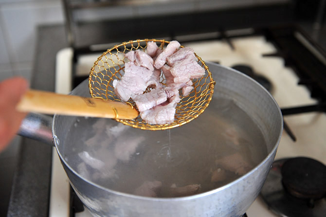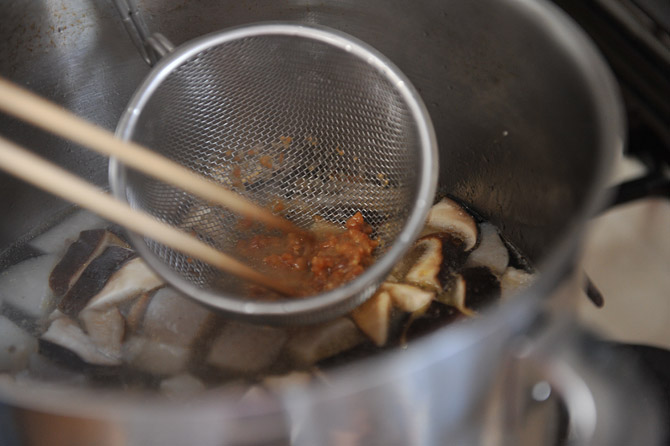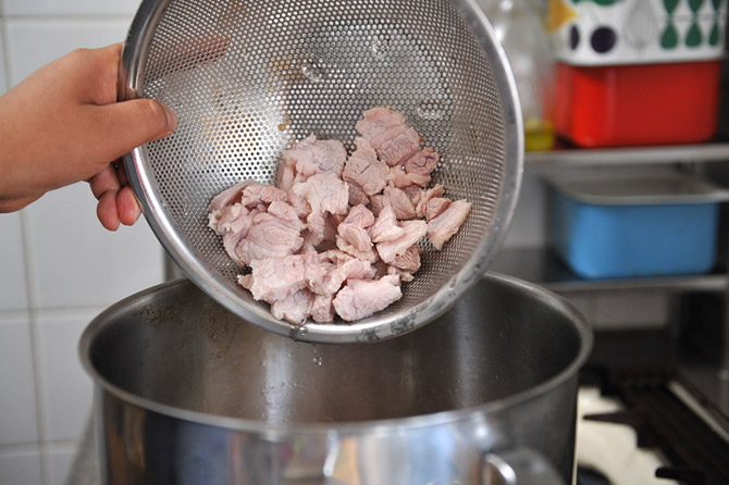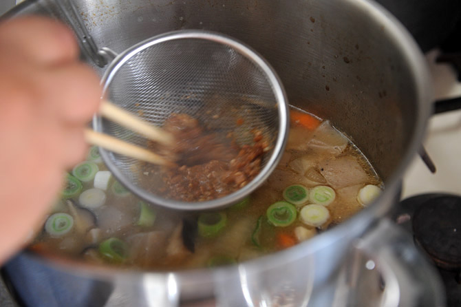 沸騰すると、アクが出るので、ていねいにすくいます。