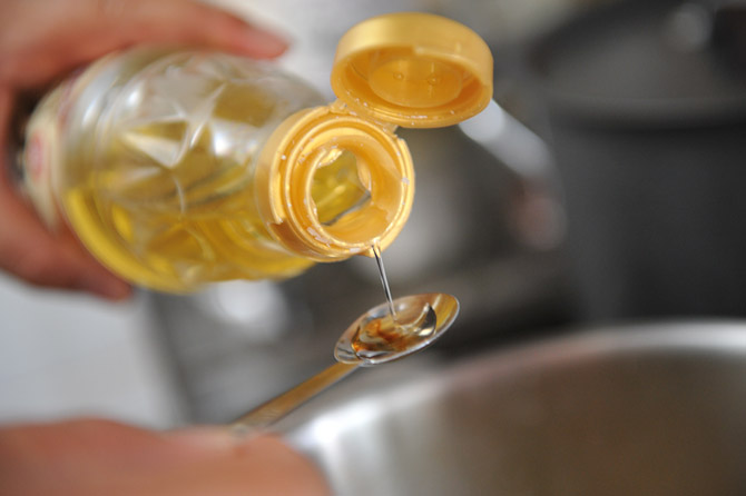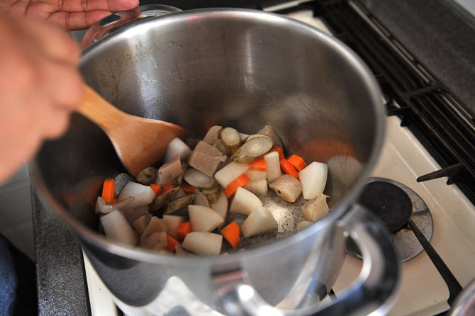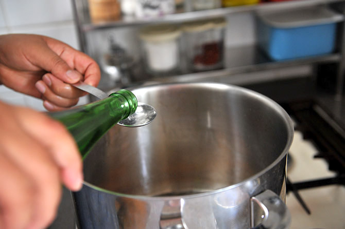 大さじ2の酒を入れて、フタをして蒸し煮にします。