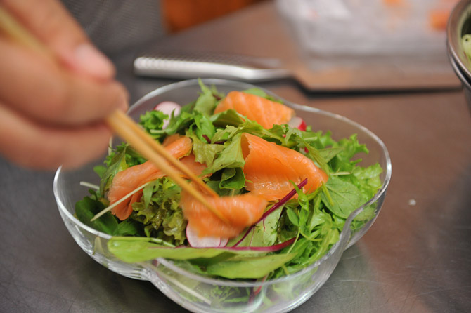 これは、ベビーリーフと、ラディッシュと、スモークサーモンです。
