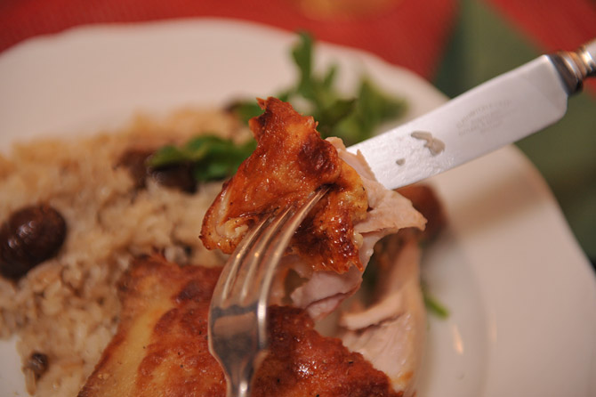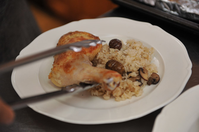 栗のピラフの上にチキンをのせて。