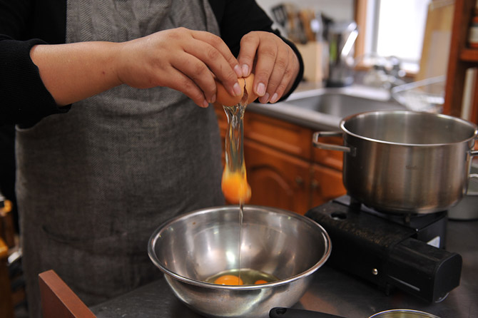 卵。常温にもどしておいて、ボウルに割り入れます。