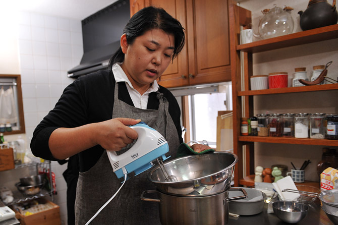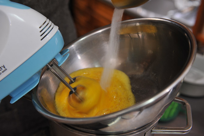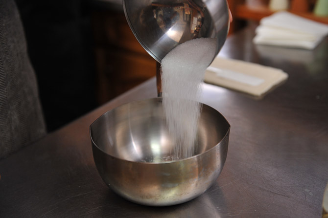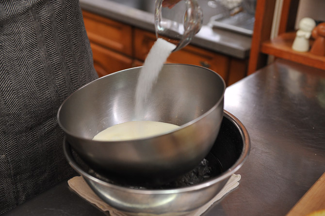 混ぜながら、グラニュ糖を入れます。