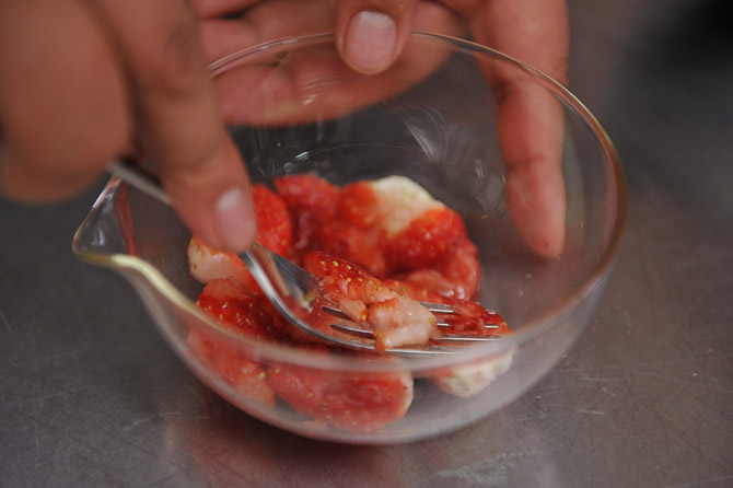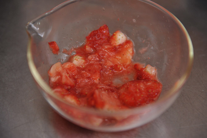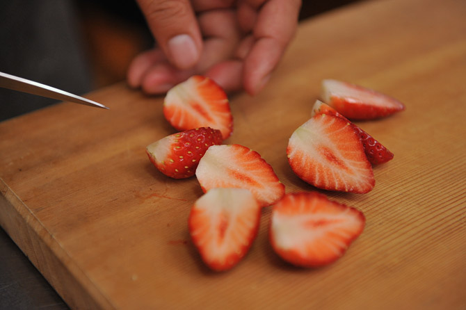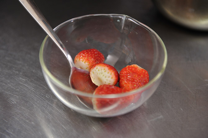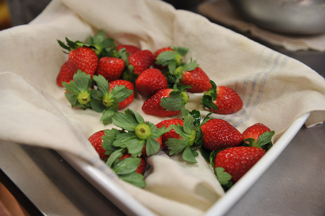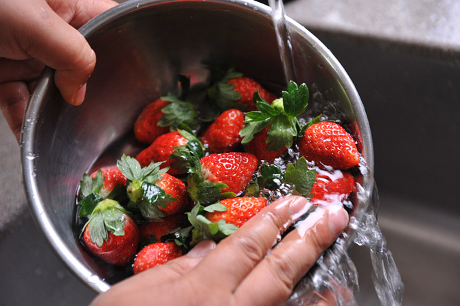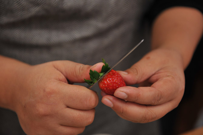 いちごを用意。洗って水を切ってヘタをとって。