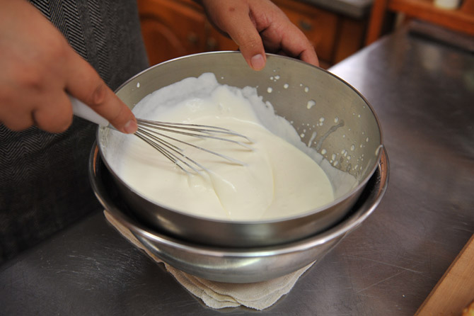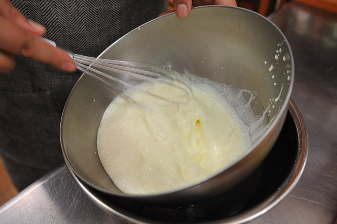 ひと肌くらいにあたたまったら、鍋から外して混ぜつづけます。