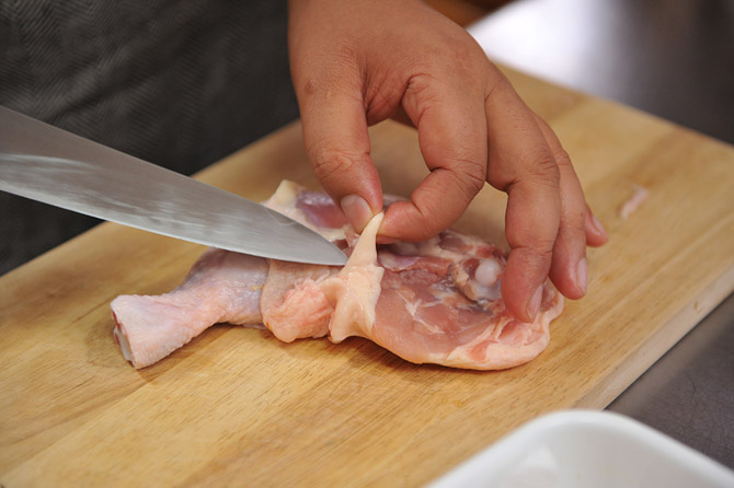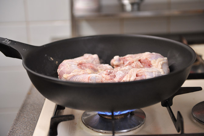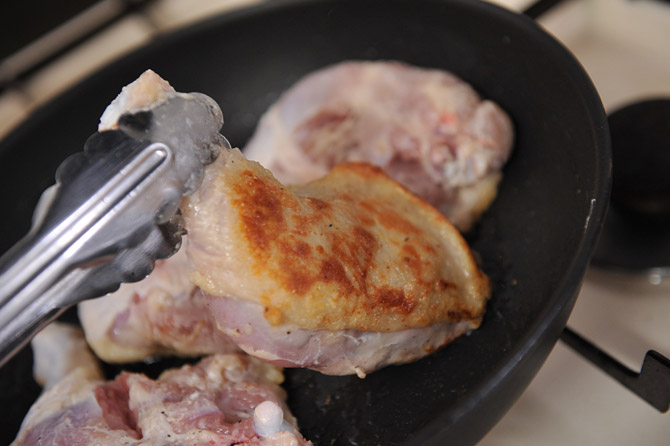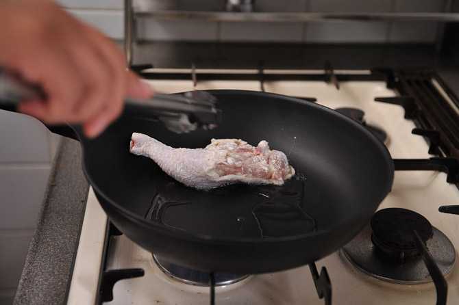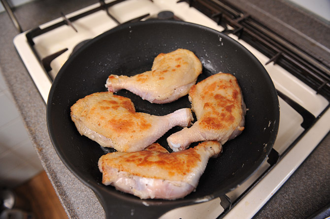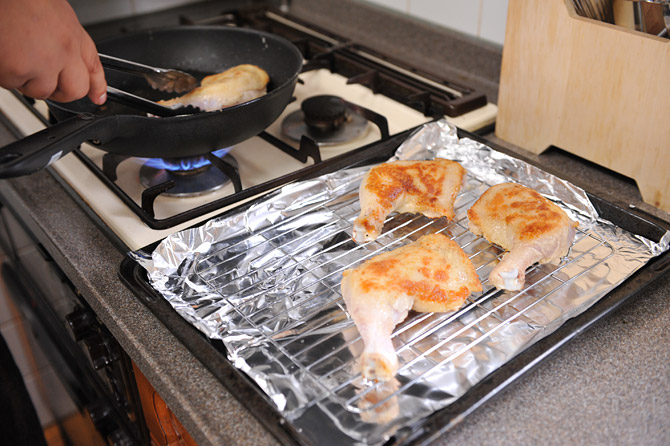 焼き目をつけた鶏肉を、