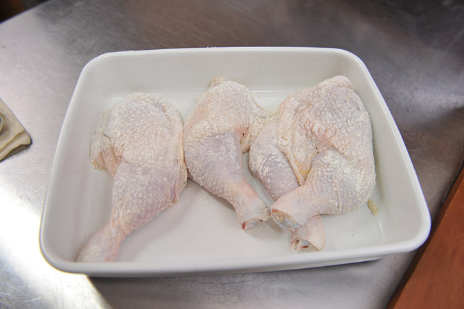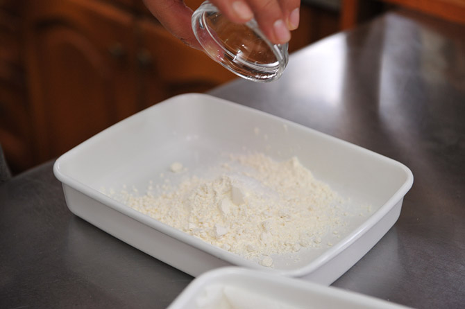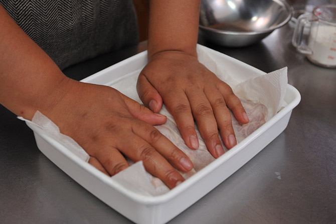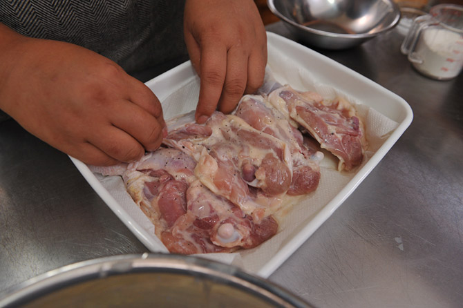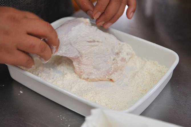 そこに鶏肉を入れて、粉をまぶします。