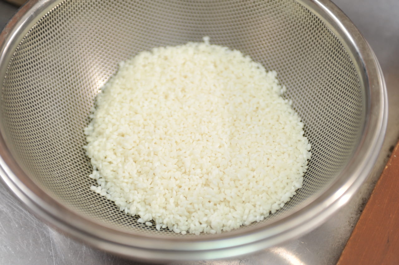 米を研いで、ザルにあげ、30分ほど、水気を切っておきます。