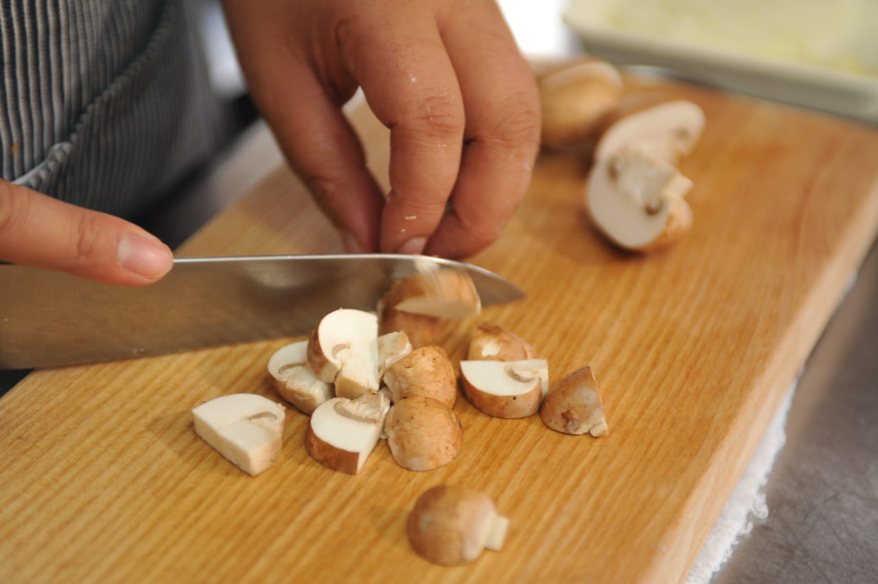 マッシュルームを半分に切って、