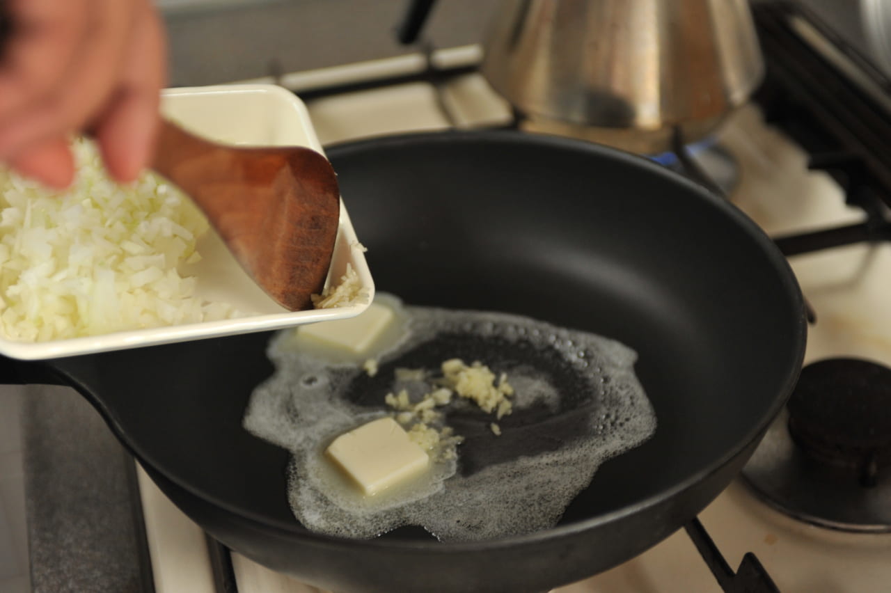 フライパンを中火で熱し、バターをひき、にんにくとたまねぎを炒めます。