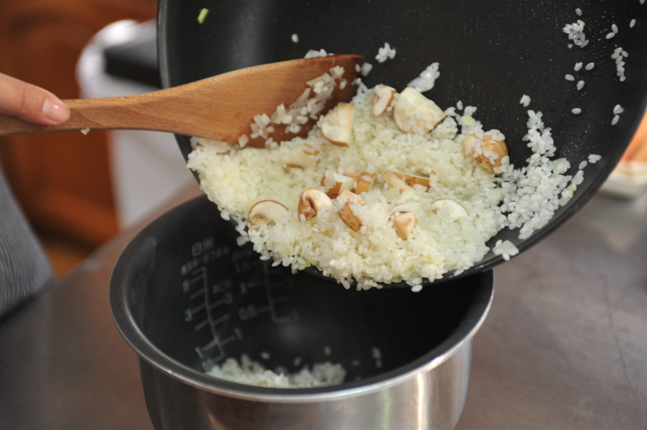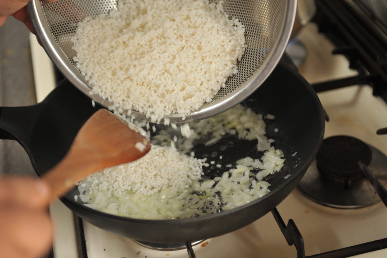 米を加えてさらに炒めます。