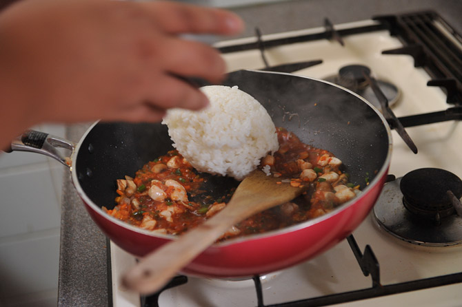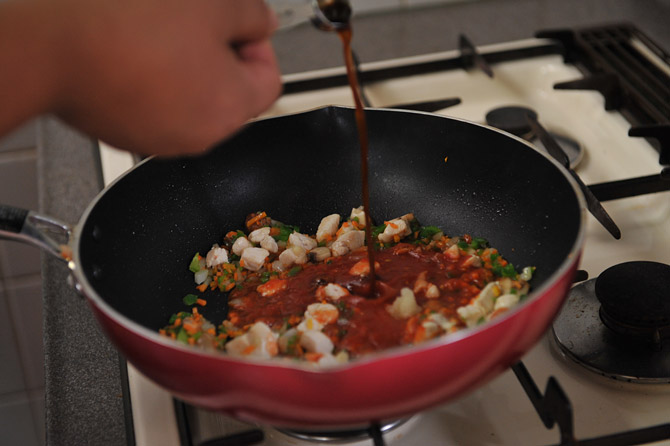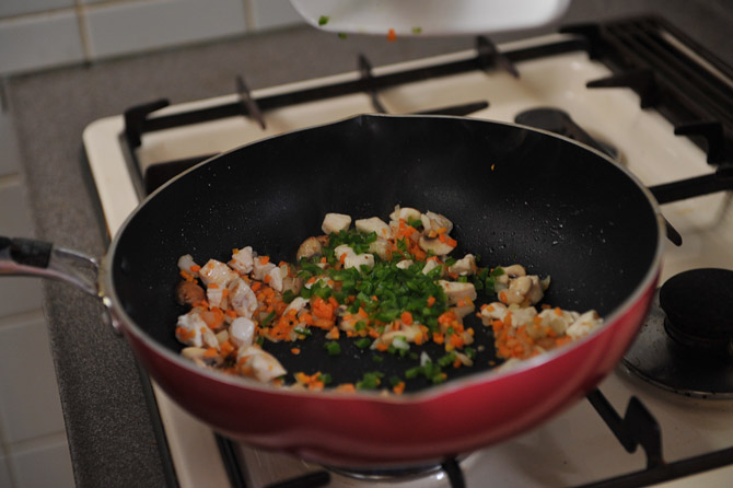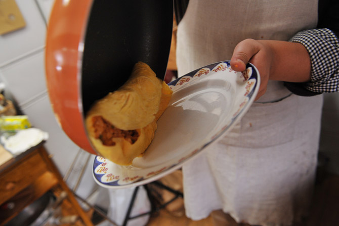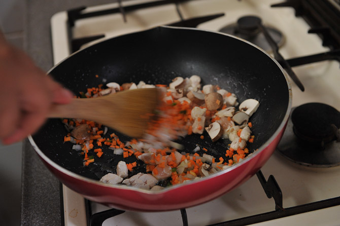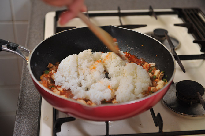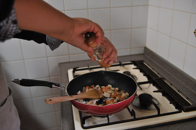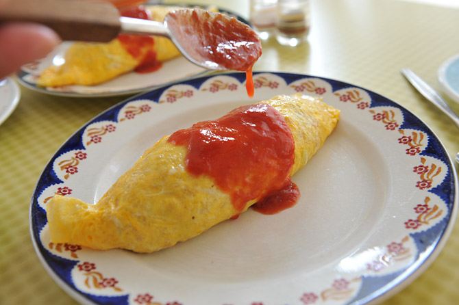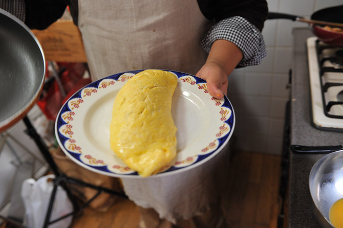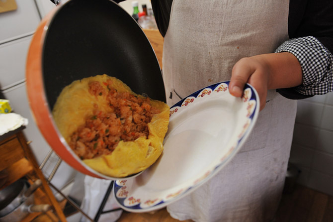 この状態でフライ返しやゴムべらで、まわりからくるんでいきます。