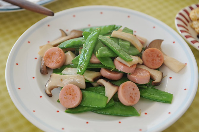 きぬさや、魚肉ソーセージ、エリンギを塩こしょうで炒めました。
