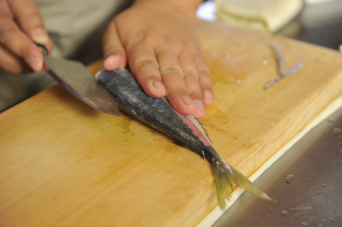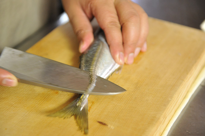 内臓をかきだしてから、「ぜいご」を、そぐように切り取ります。