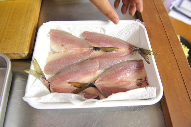うろこを尾から頭に向かってこそげ取り、 頭をおとしたあじ。