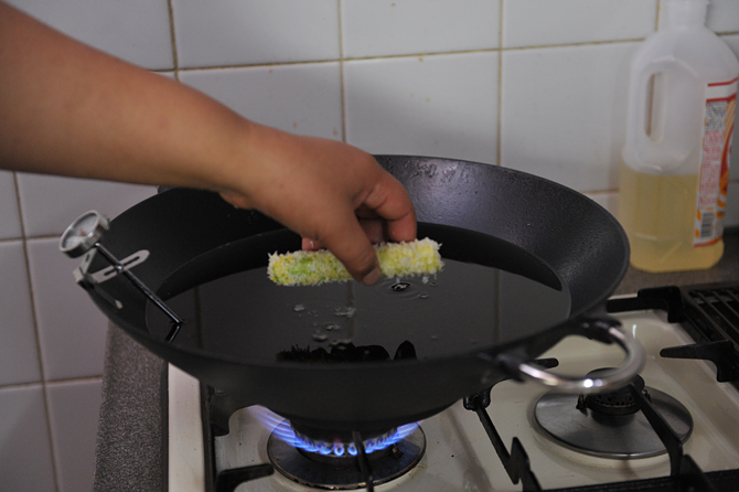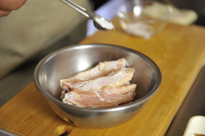 すぐに盛りつけず、上げるときは、軽く油を切るように、ふります。