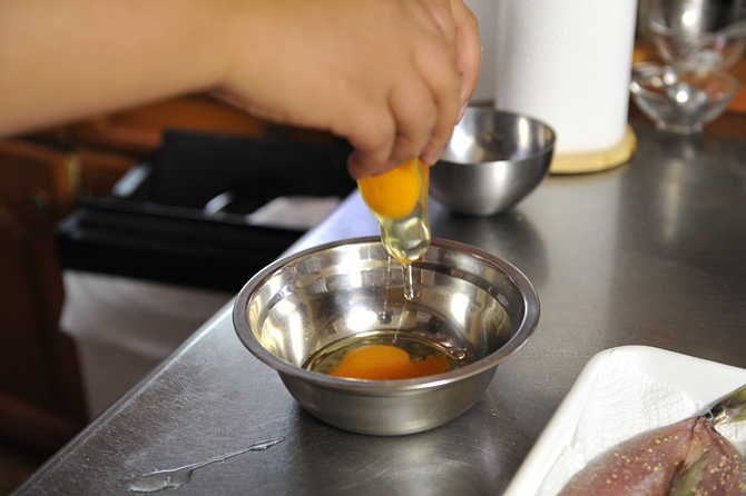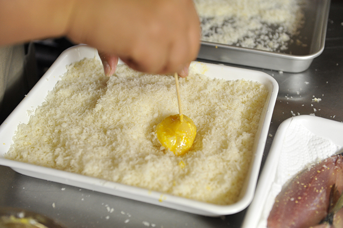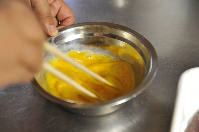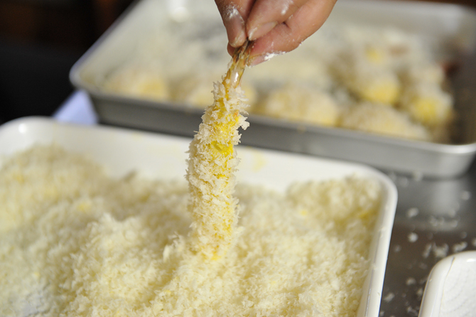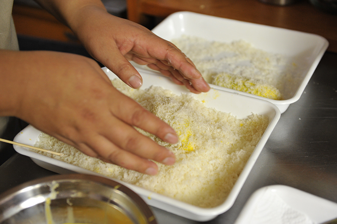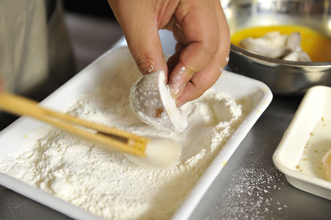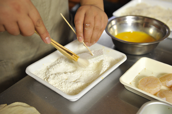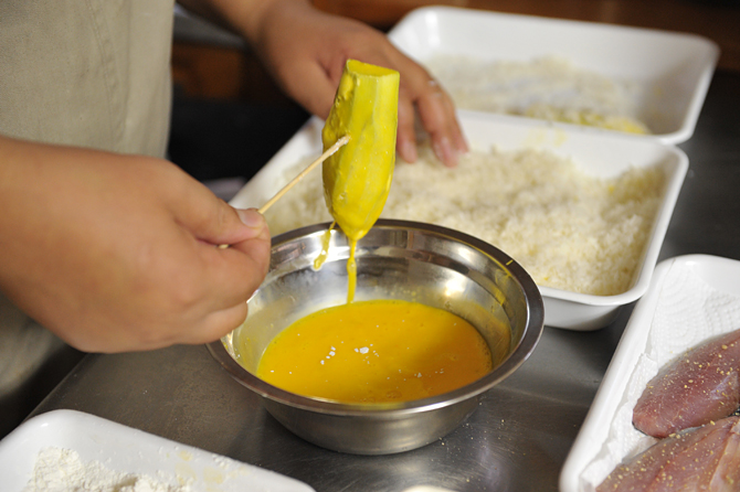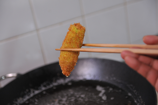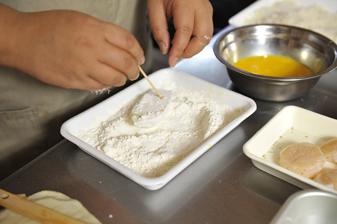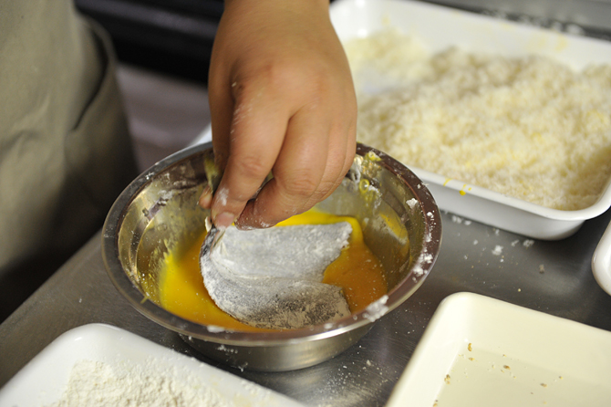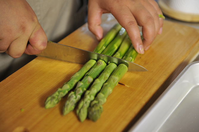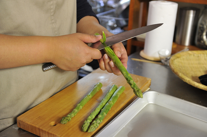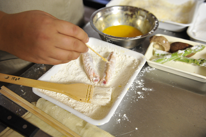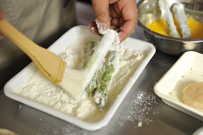 アスパラは、乾いたままだと、小麦粉がつきにくいんです。