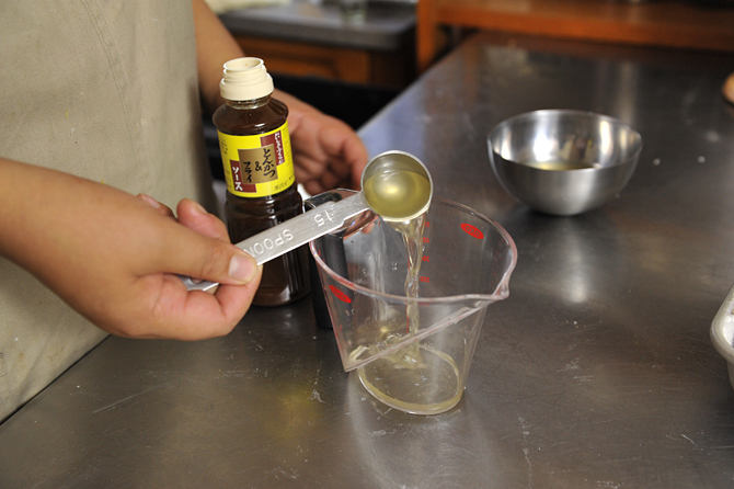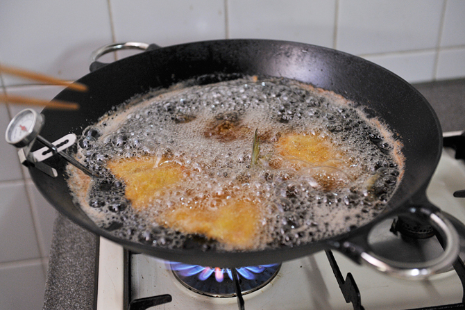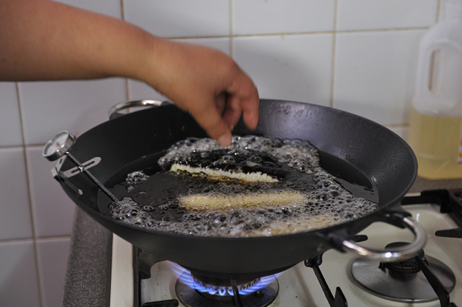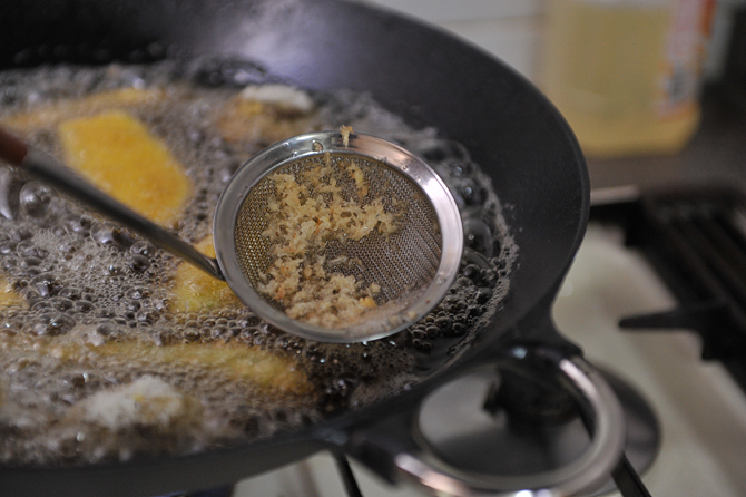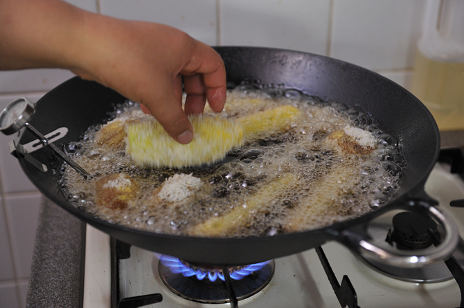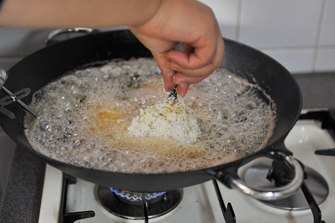 油に落とすとはねるので、左手に網じゃくしを添えても。