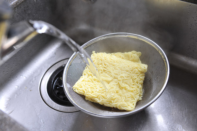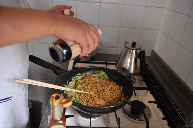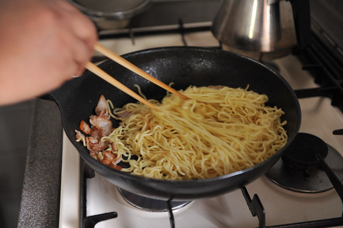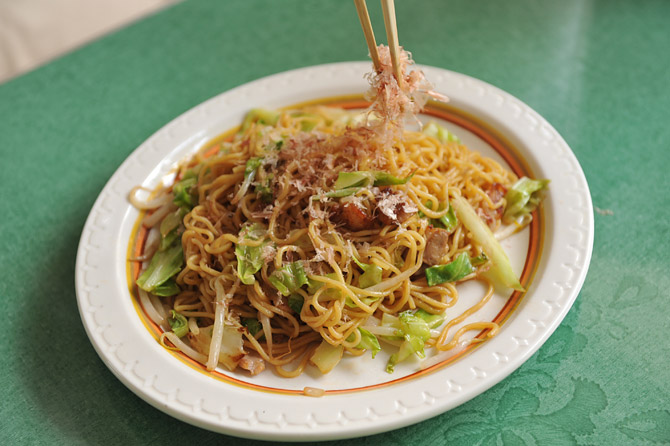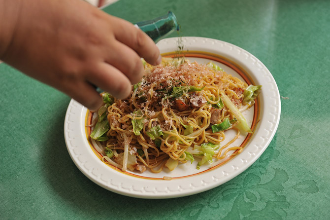 おにいちゃんは、さらにゴハンを食べながら、焼きそばも食べたい。