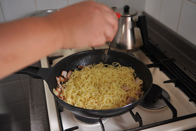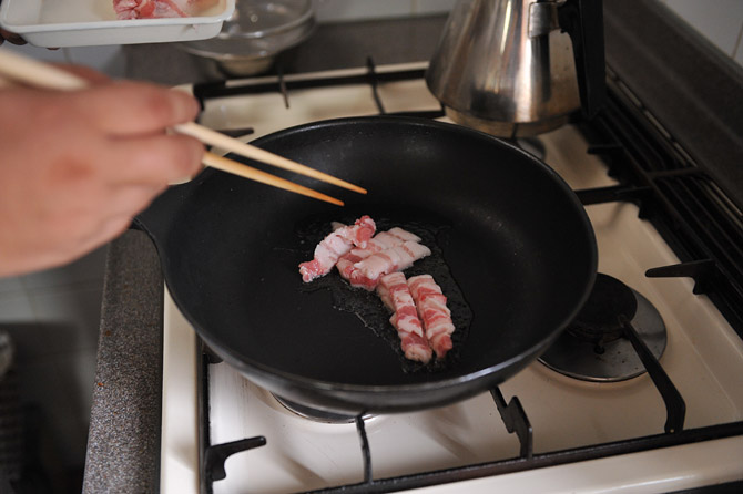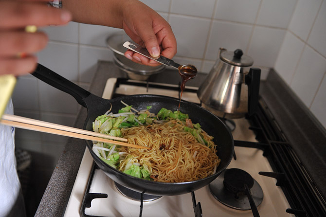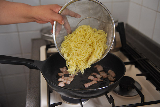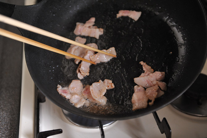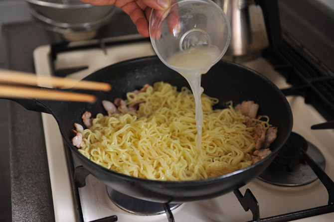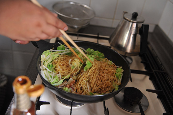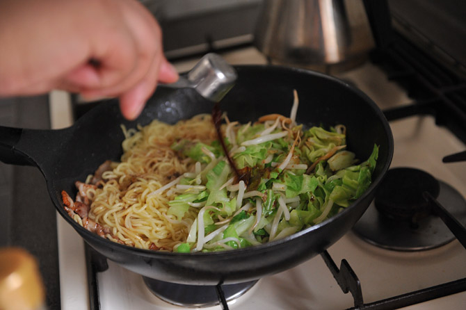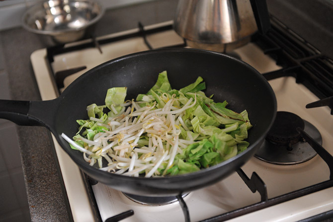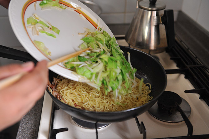 強火でキャベツ、もやしを約1分焼くように炒めます。