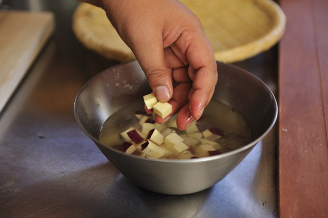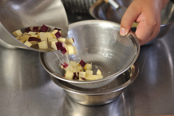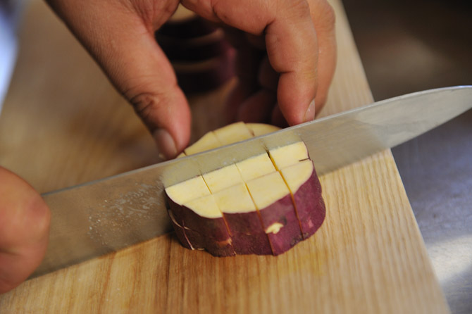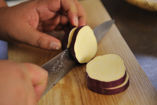 まずは、さつまいもを洗い、皮ごと、1センチの厚さに切ります。