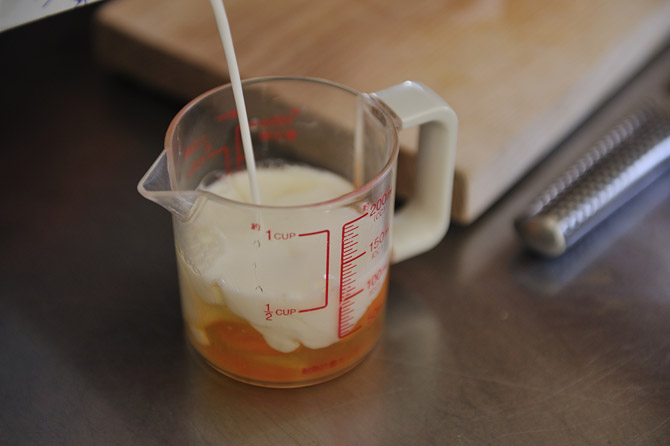 そこに牛乳を注ぎ、「合計130cc」になるようにします。
