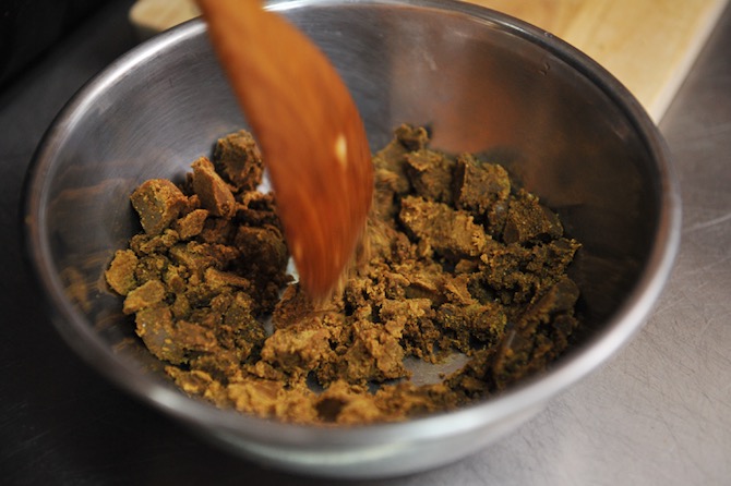 ボウルに2種類のカレールーを混ぜて砕きます。