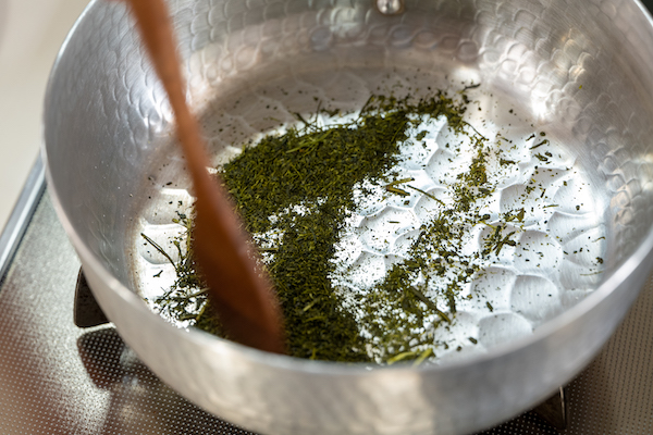 乾いた鍋でお茶の葉を香りが出るまで煎ります。