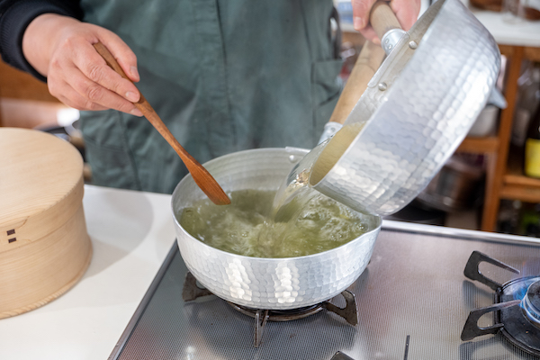 ①に塩を加えて温めただし汁を注ぎ、1分蒸らします。