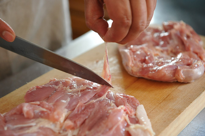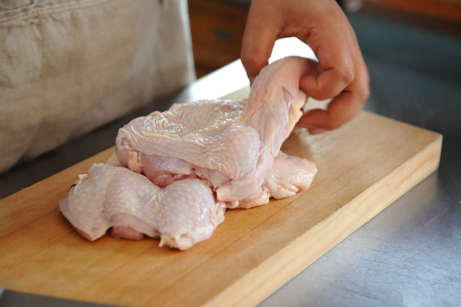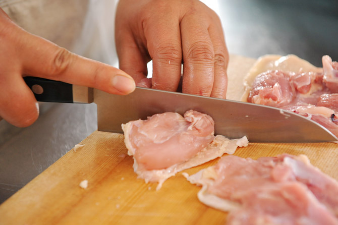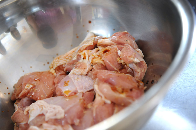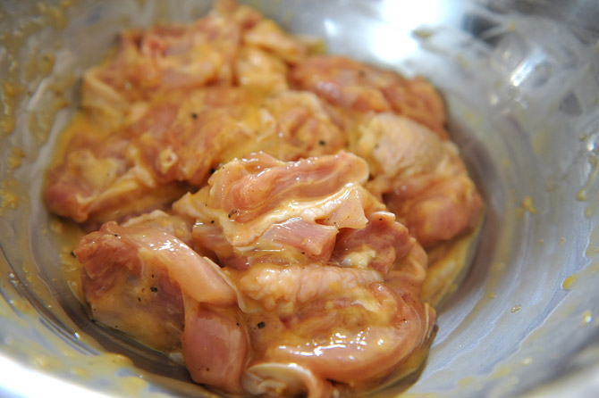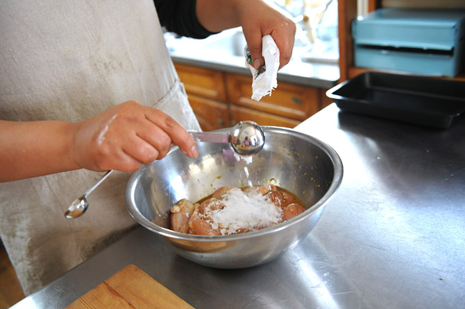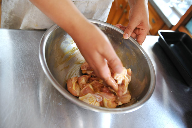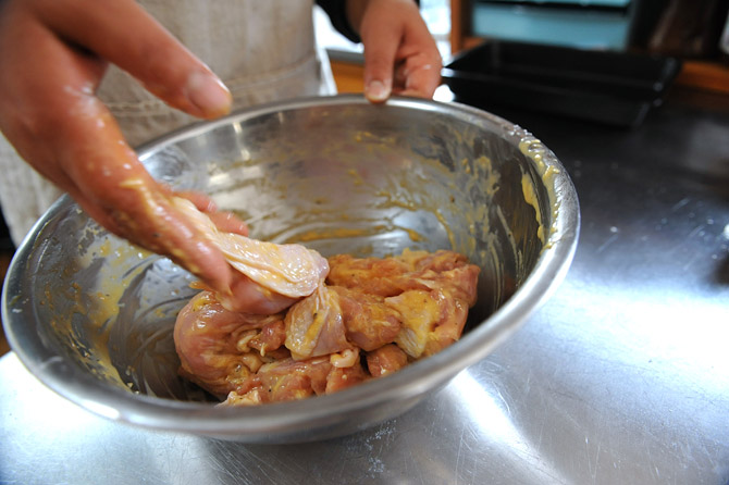 味をなじませた鶏のもも肉を、ボウルにあけます。