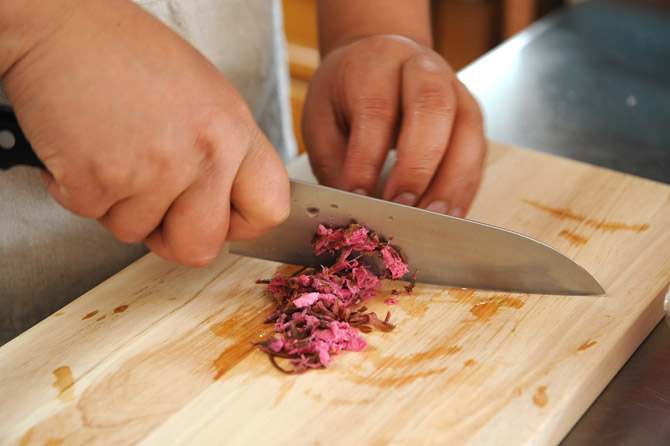 まず、さくらの花の塩漬けを刻みます。