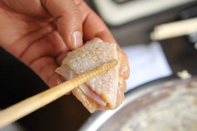 皮をぱりっと揚げたいので、ひとつずつ、菜箸で皮を