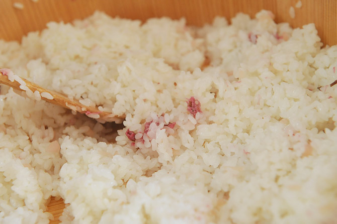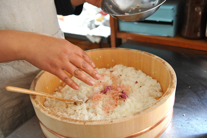 さくらの塩漬けと生姜の漬物をまぜた酢めしをつめて、