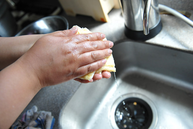 お酢を水にといた「酢水」で手をぬらし、