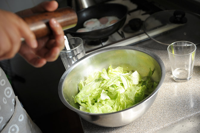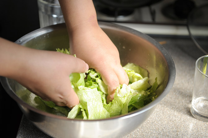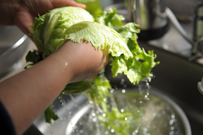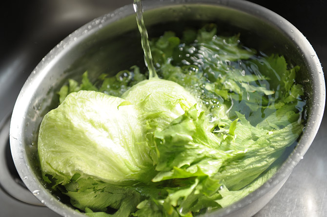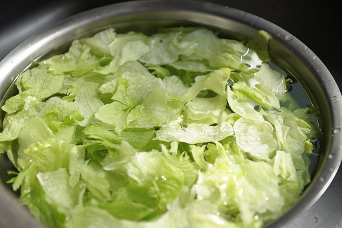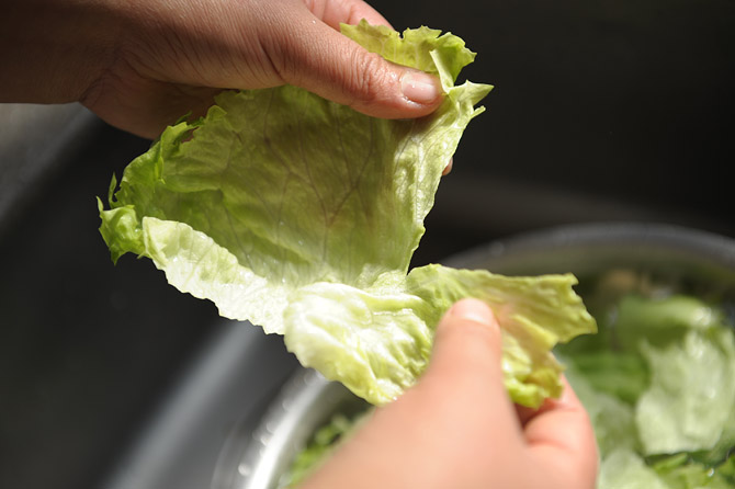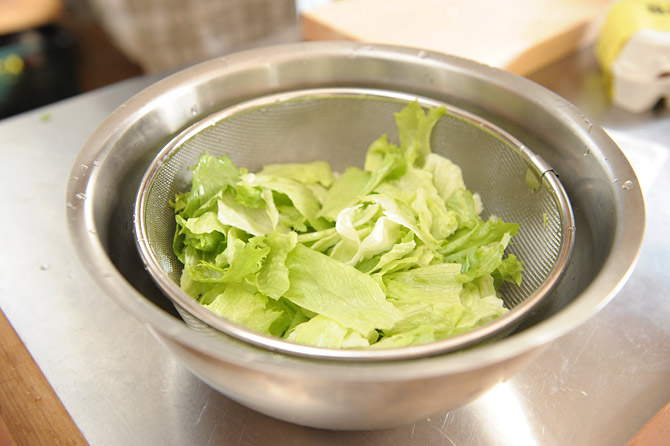 ざるを、ふたつあわせて、その中にレタスを入れ、