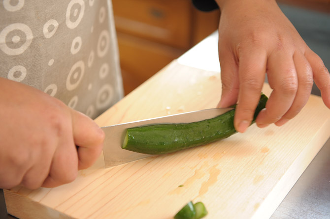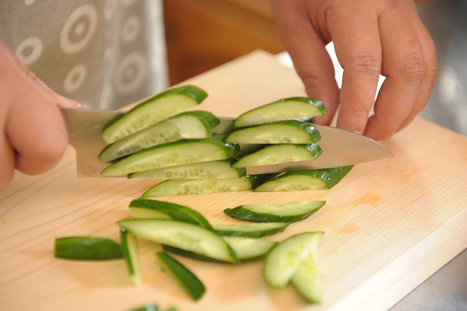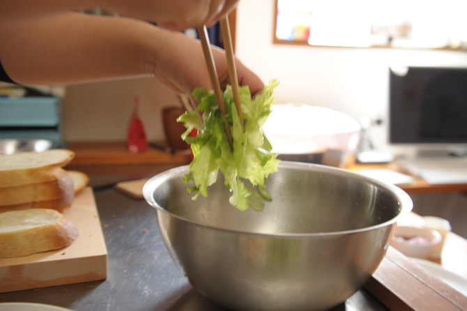 輪切りにすると、うまくレタスとからまないんだそうです。