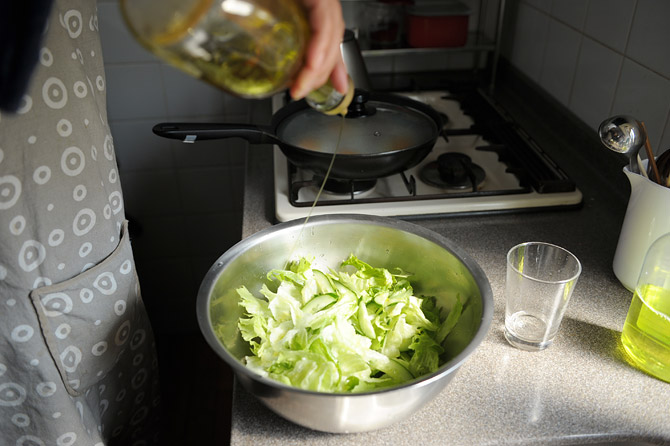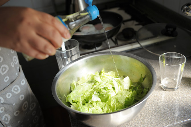 まず、エキストラバージンオリーブオイルを、まわしかけます。