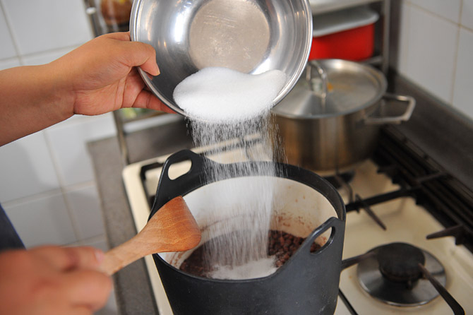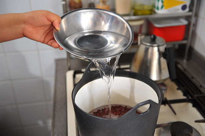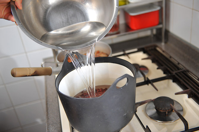 小豆の頭が出るくらいまで。そうしたらお砂糖を加えます。