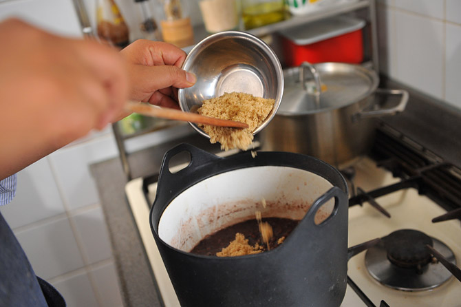 砂糖を入れる前に汁を少しすくって減らしましょう。